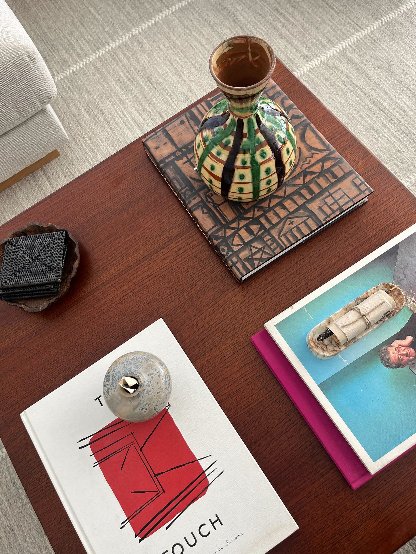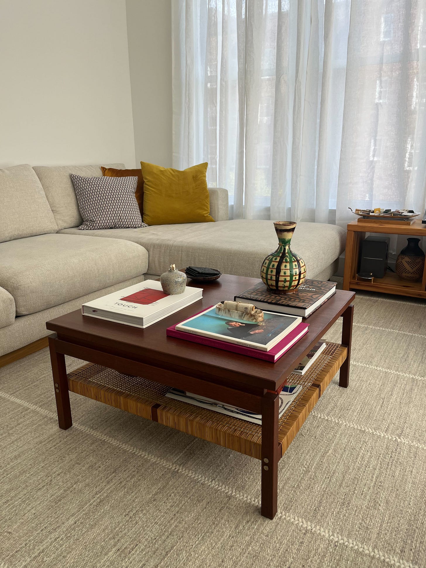 “The best thing I ever thrifted is a square teak wood coffee table from the 1950s. I can’t tell you how long I’d been searching for the perfect coffee table (definitely over a year). Finding something vintage wasn’t the only box I was trying to check. I wanted it to be square and have a shelf so I could style it with books and objects. I also needed it to be fairly lightweight so I could easily move it from apartment to apartment (I’ve moved twice in the past year alone). This piece had everything I was looking for.