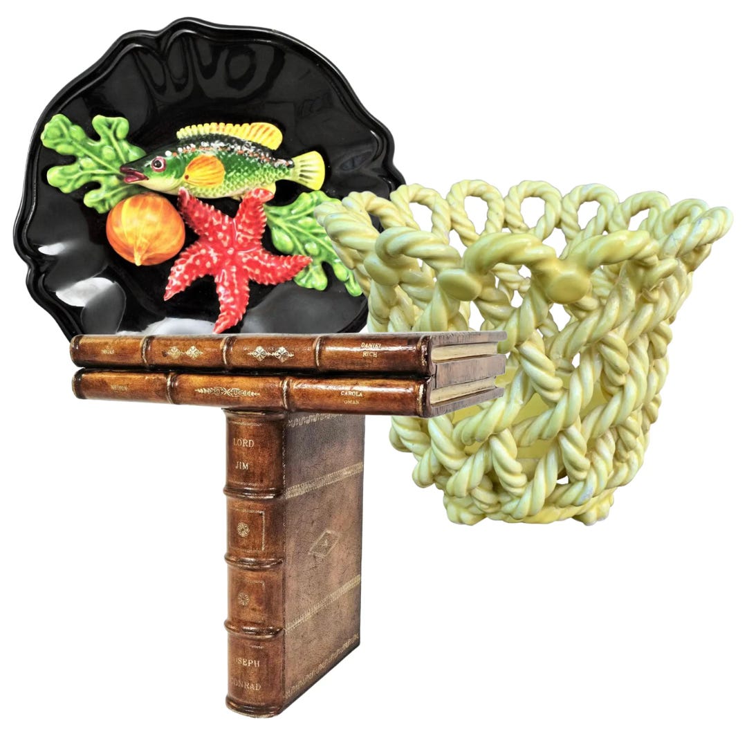 Some more currently available pics: a Vallauris Majolica ceramic wall plate with seafood design, French ceramic woven rope basket, and Maitland-Smith leather book bracket.