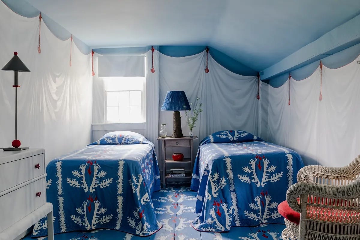 The below space — designed by Nick Olsen — features faux-draped walls and ceiling painted by decorative artist Agustin Hurtado. The floors were also painted, to mimic the bed covers, adding even more oomph and whimsy to the space.