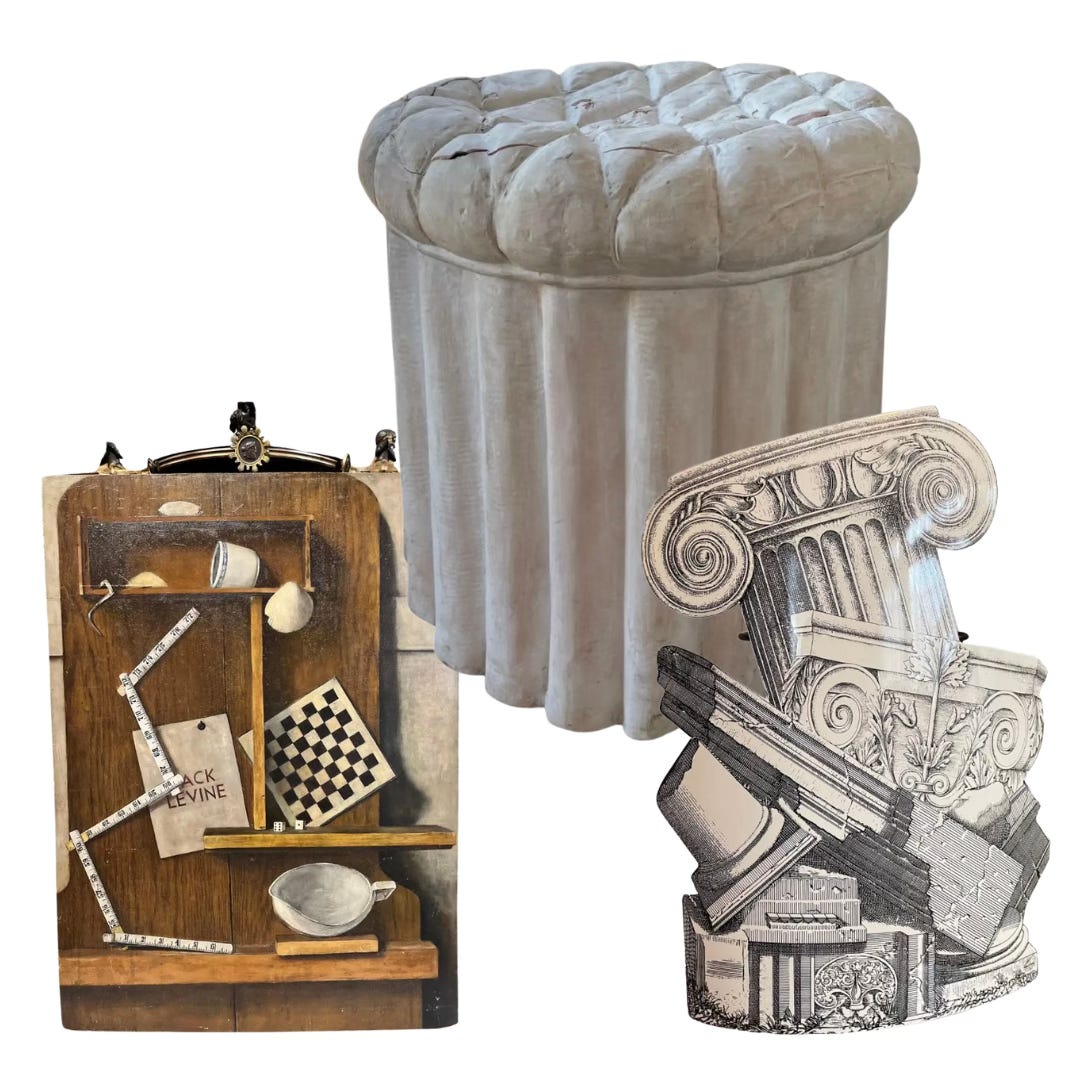 There’s a lot of tromp l’oeil on the secondhand market these days (typically pretty expensive, but worth a look if only to gather inspiration). I love the above vintage trompe l’oeil painting, plaster ottoman, and Fornasetti umbrella stand.