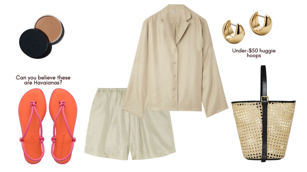 Silk shorts // silk shirt // pink flip-flops // woven bag // bronzer // gold hoops