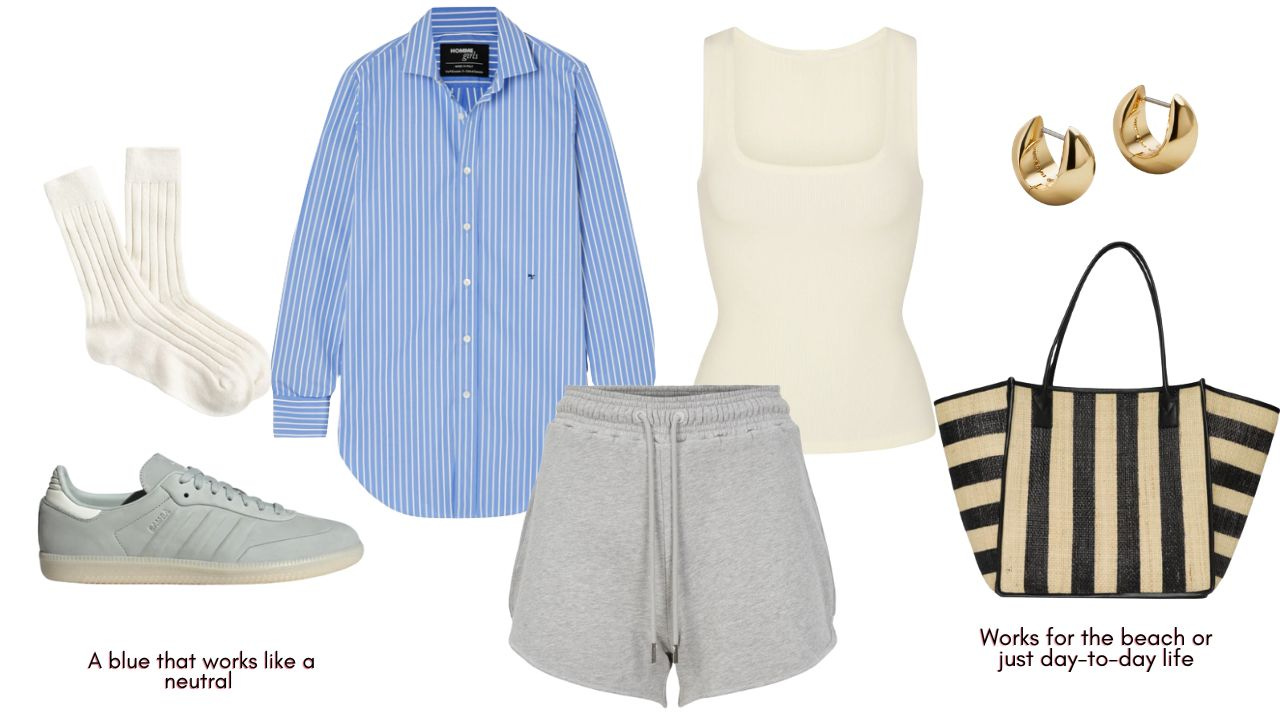 Gray sweat shorts // white tank // striped button-up // Sambas // trouser socks // striped tote // gold hoops