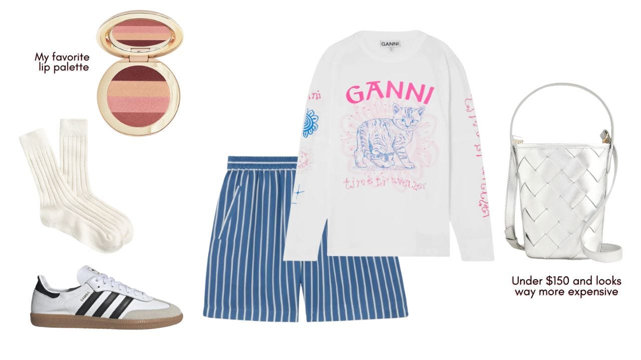 Striped shorts // t-shirt // metallic woven bucket bag // Sambas // lip palette // trouser socks