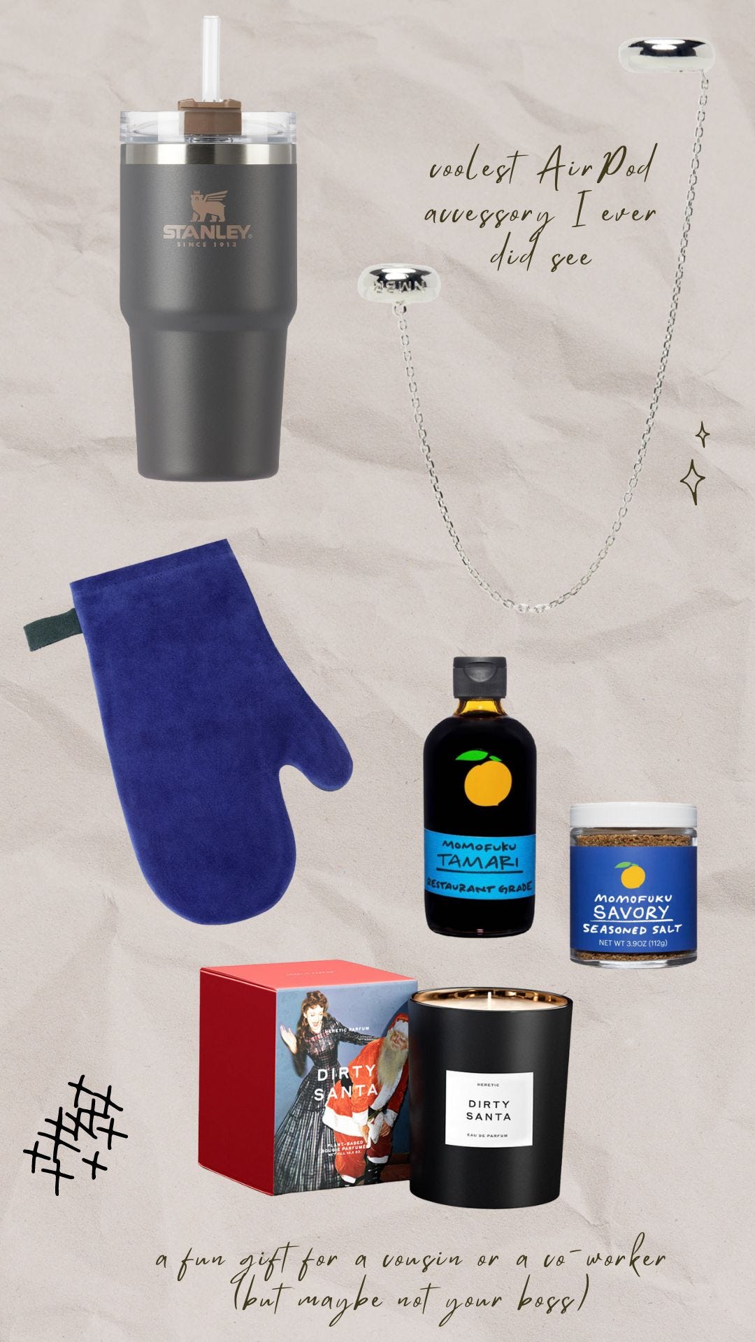 I happen to think this silver chain ear cuff by Numbering would be an excellent gift for your very cool, definitely-on-TikTok Gen Z colleague. One side serves as an ear cuff on the top of your ear and the other side has a little slot for an AirPod—so you can listen to your podcast in serious style.