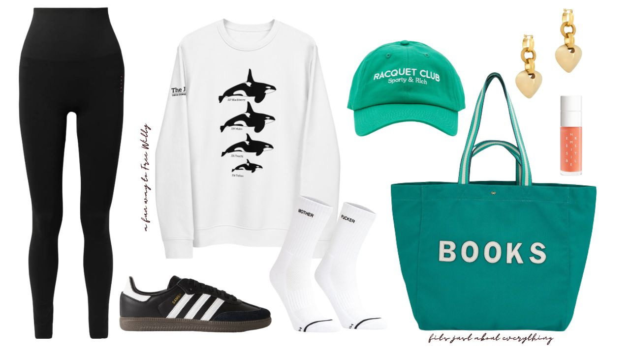 White eco crewneck Orca conservancy sweatshirt // black and white Adidas Sambas // ergonomic full-support stretch leggings // Racquet Club baseball cap // Mother socks // Hérmes lip oil // gold earrings // Books tote