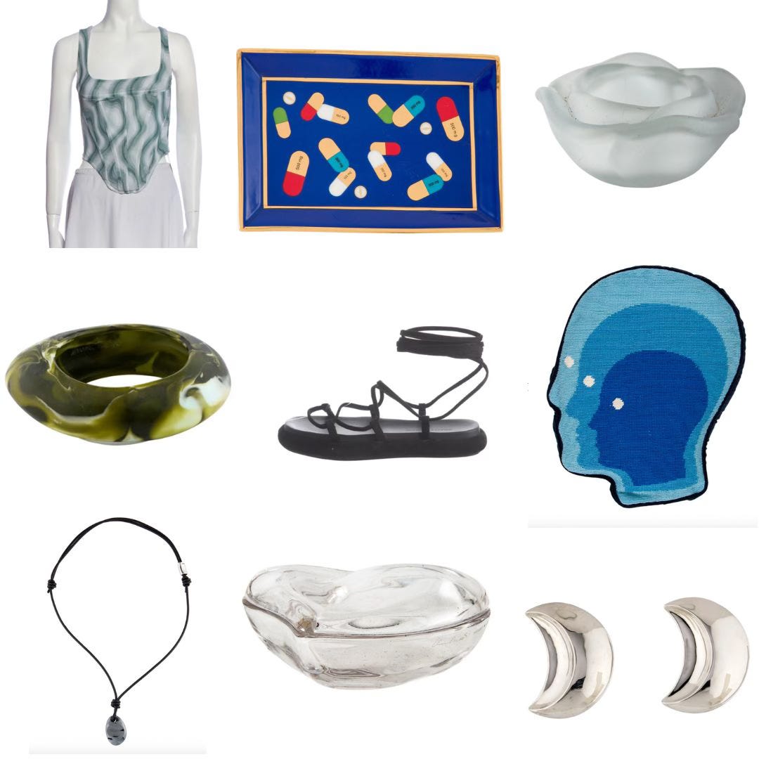 from top left: Miaou corset, $33; Jonathan Adler tray, $63; Christian Dior candleholder, $75; Dinosaur Designs bangle, $80; Khaite gladiator sandals, $68; Jonathan Adler needlepoint face pillow, $72; Tateossian pendant necklace, $95; Elsa Peretti for Tiffany heart box, $86; Julietta moonlight earrings, $95