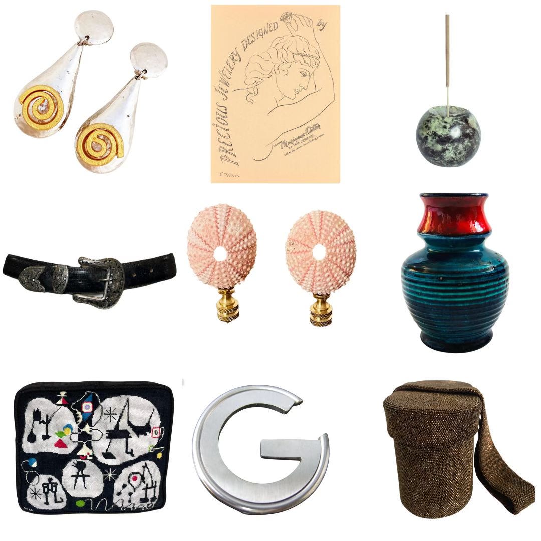 from top left: 1980s mixed metal earrings, $98; Ernest Fiene 1953 lithograph, $100; green incense holder, $59; western belt with abalone buckle, $95; sea urchin lamp finials, $72; mid-century German vase, $80; Joan Miró needlepoint pillow, $75; Gucci bookmark, $95; vintage copper beaded box purse, $98