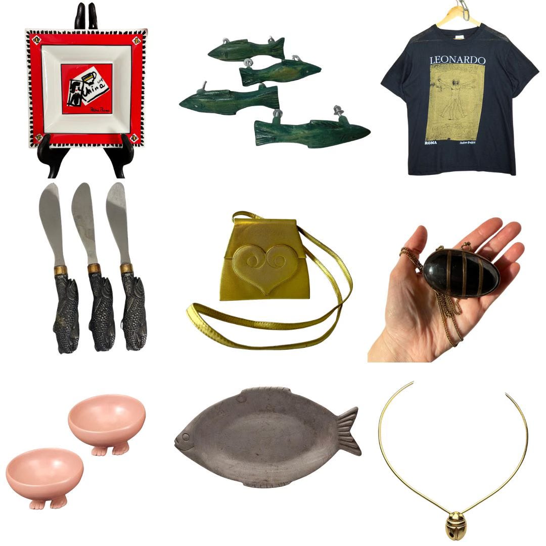 from top left: Villeroy & Boch X Paloma Picasso trinket dish, $45; carved fish doorknobs, $32; 1990s Leonardo Da Vinci tee, $41; Arthur Court fish butter knives, $24; 1980s Paloma Picasso bag, $65; brown lucite and brass minaudière, $55; Metropolitan Museum of Art replica footed bowls, $35; Arthur Court cast aluminum fish plate, $40; scarab choker, $88