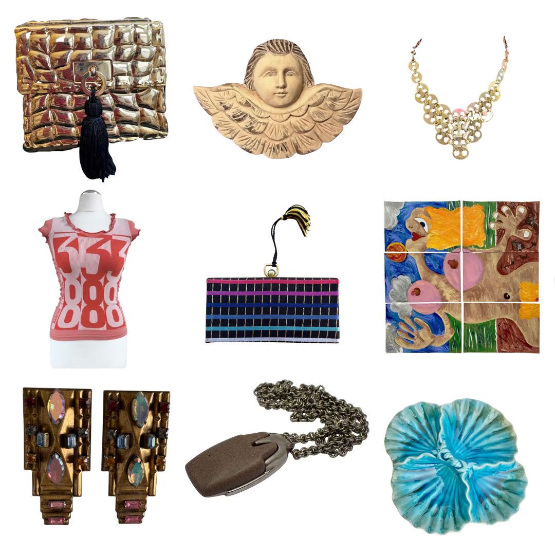 from top left: gold and black tassel handbag, $92; carved angel, $40; Paco Rabanne necklace, $99; Marithe + Francois Girbaud pale pink stretch top, $35; 1950s colorful silk clutch, $48; 2001 six-piece nude painting, $95; statement clip-on earrings, $35; Paco Rabanne pendant, $76; mid-century ceramic serving dish, $38