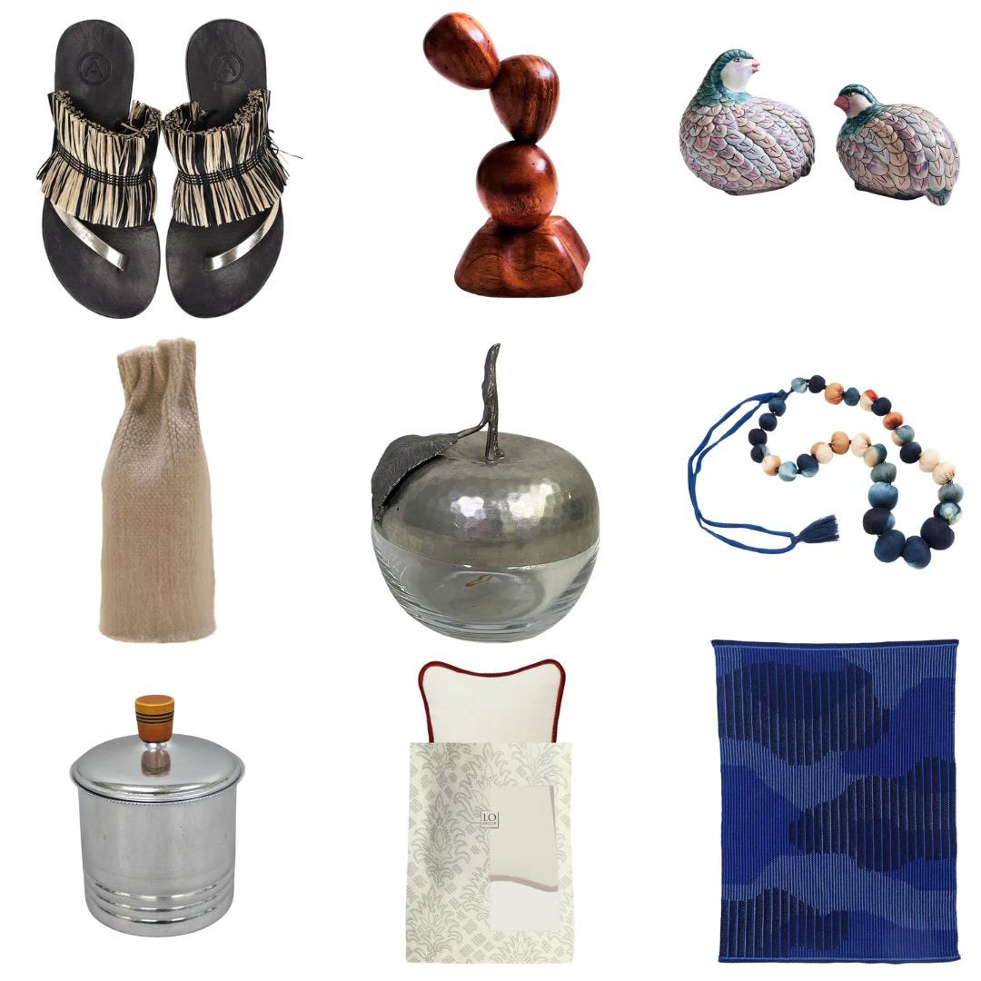 from top left: Alvaro Gonzalez raffia fringe thong leather sandals, $75; large wood cactus toothpick holder, $75; Toyo ceramic quails, $68; brushed silk vase, $90; 1950s apple box, $84; silk beaded necklace, $89; Art Deco silver plated sugar bowl with Bakelite handle, $39; white pillow with brick piping, $70; organic cotton table mat (set of two), $60