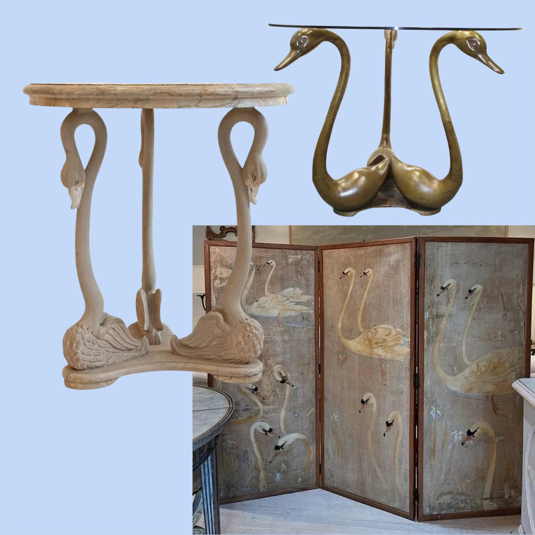 Wooden swan furniture. Magazine racks, side tables, decorative wall shelves, hand-carved mirrors — if it’s shaped like a swan and made of wood, grab it. Bonus points if it’s got that honey-toned vintage finish.